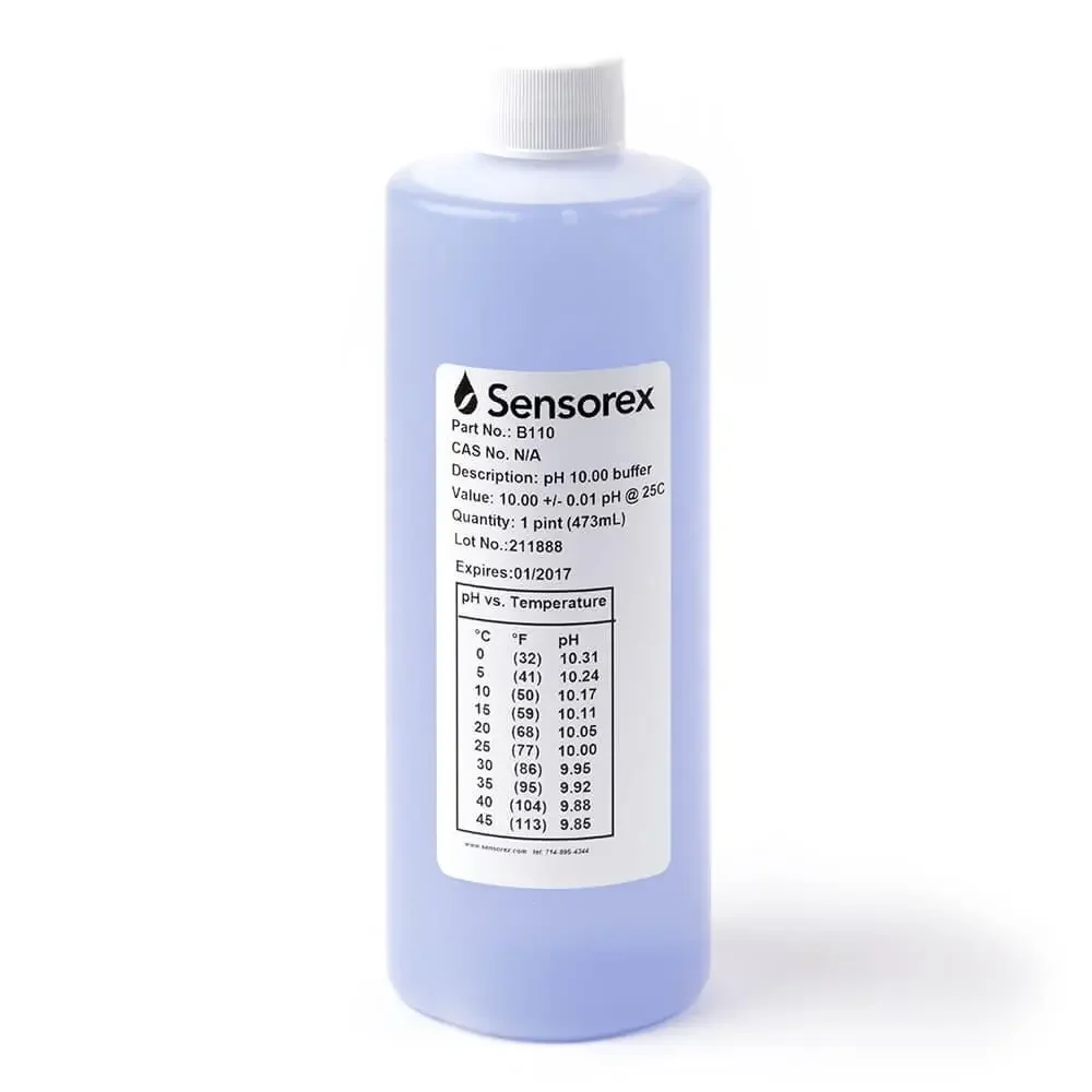 Las soluciones tampón pH Sensorex se usan para calibrar sensores de pH. Los tampones están codificados por color para (rojo) 4.01. (amarillo) 7.00 y (azul) 10.00. Estos tampones son trazables por NIST y precisos dentro de ± 0.01 unidades pH a 25°C, y se mantienen estables durante largos periodos. Los tampones se suministran en pintas (473 ml).